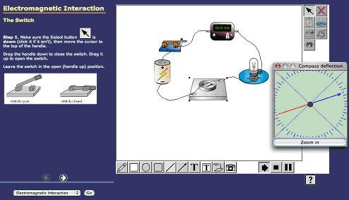For example you might use the simulator to explore the electromagnetic interaction by observing what affect more batteries or more loops may have on the deflection of a compass needle in a closed circuit.